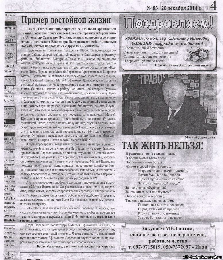 .Игорь Пораденко поблагодарил Матвея Ефимовича за книги, за визит, и сказал, что литературная ассоциация «Буджак» гордится тем, что в ее составе есть такой писатель. Я тоже считаю, что жизненный путь и опыт Матвея Ефимовича Деревенчи служит хорошим примером каждому, кто хочет достойно прожить свою жизнь.