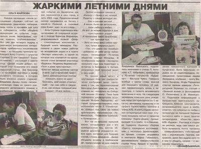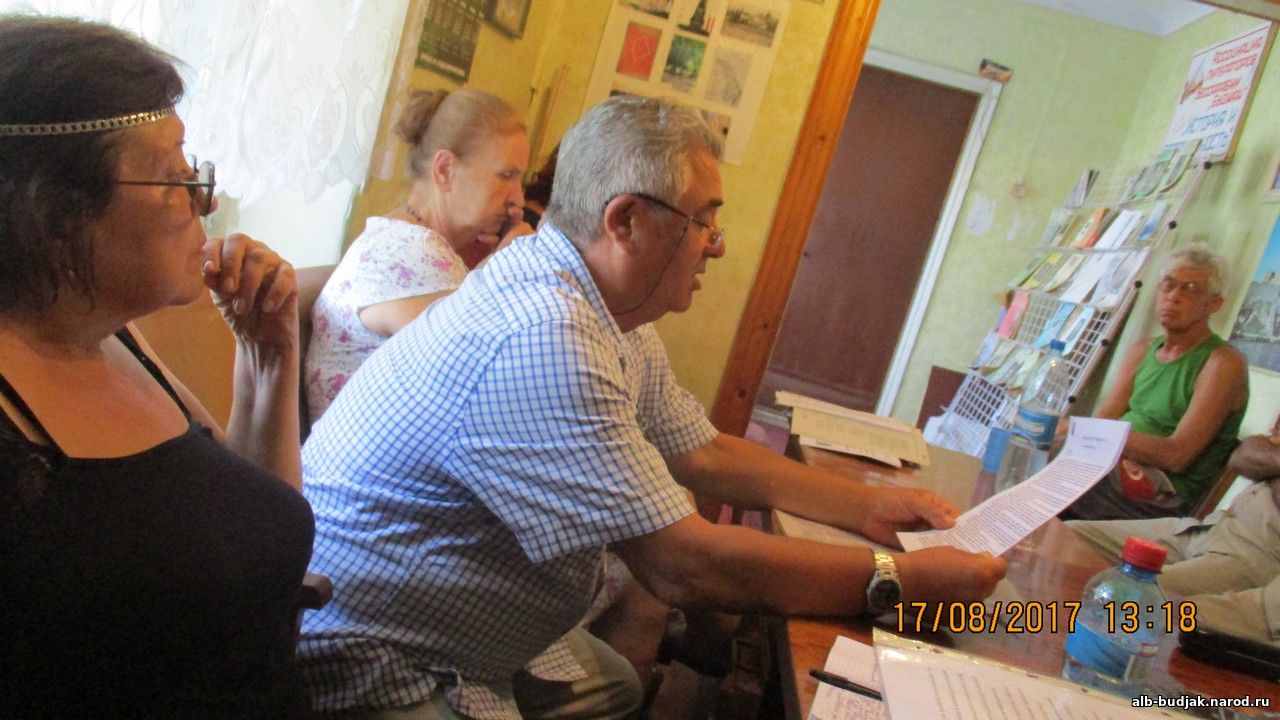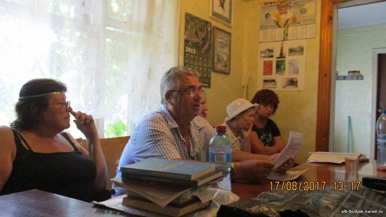 Далее обсудили встречу в Шабском ДК, приуроченную к Дню смерти Владимира Высоцкого, поделились мнениями о стихах Павла Антонова-Днестрова и Георгия чабаненко, написанные к 70-летию патриотки "Буджака" Висланы Чуйко. Говорили вообще о магии слова, важной для пишущего человека, об умение перевоплощать жизнь в литературу, о таланте мгновенного включения в игру. На следующем заседании отмечали День рождения Аллы (он приходится на 5 августа) , виновницу торжества и её супруга торжественно приняли в члены АЛБ, и вновь студию заполнил литературный пинг-понг. Ступина посылала сигнал о талантах Снежаной Кирпи-Додон, проживающий то в Шабо, тов Кишинёве, подарила "Буджаку" сборник "Одессу покинувших воспоминания..." с несколькими фривольными, но яркими стихами академика и лингвиста Марка Габинского, декламировала юмористические строки Нины Аведон о прохождении таможенного контроля в Кучурганах. Был прослушан отрывок из её передачи, посвященной талантливым людям Аккермана, особенно поэту - Феликсу Закирову. Игорь Параденко ответил свежим номером "Литературной Украины" со статьей о "Зеленой волне" и фотографии Олексы Резниченко и Михаила Жванецкого. Поделился информацией о путешествии оригинального публициста Алексея Шестаковича, остановившегося ныне в Шабо, отметил что собратья по любви к литературе из Западной Украины пытаются найти в своих пенатах литературные общества через АЛБ "Буджак".